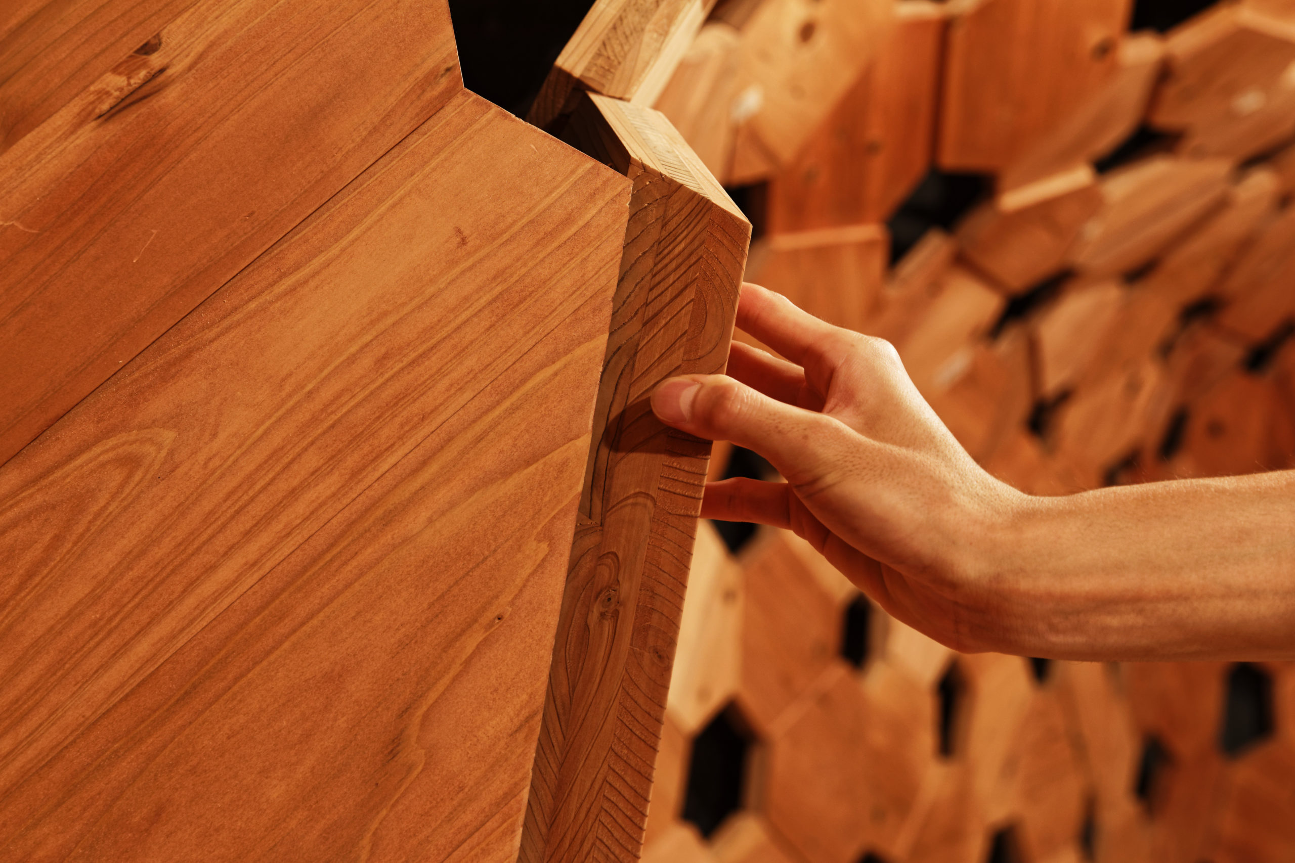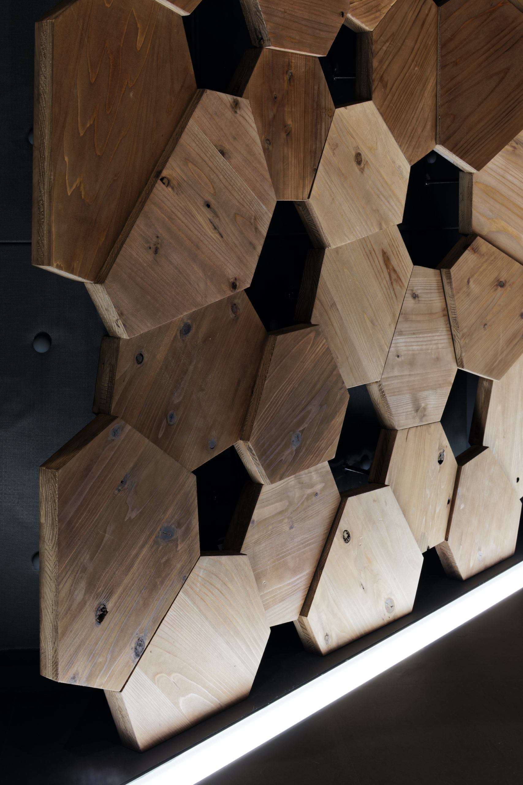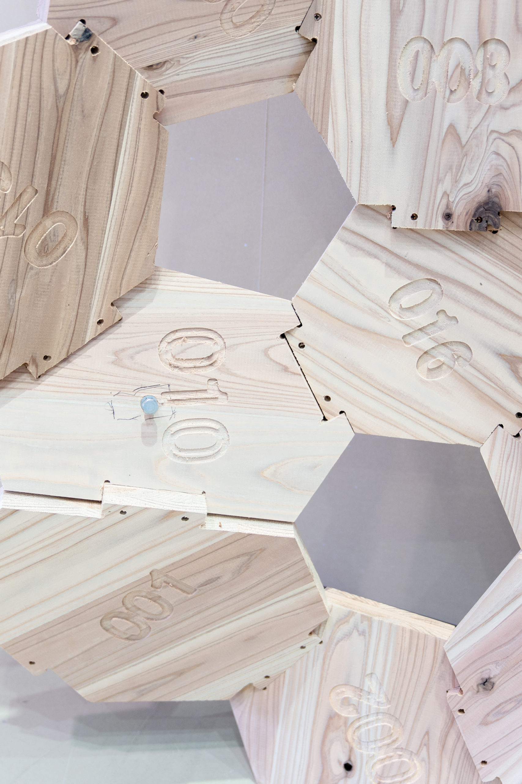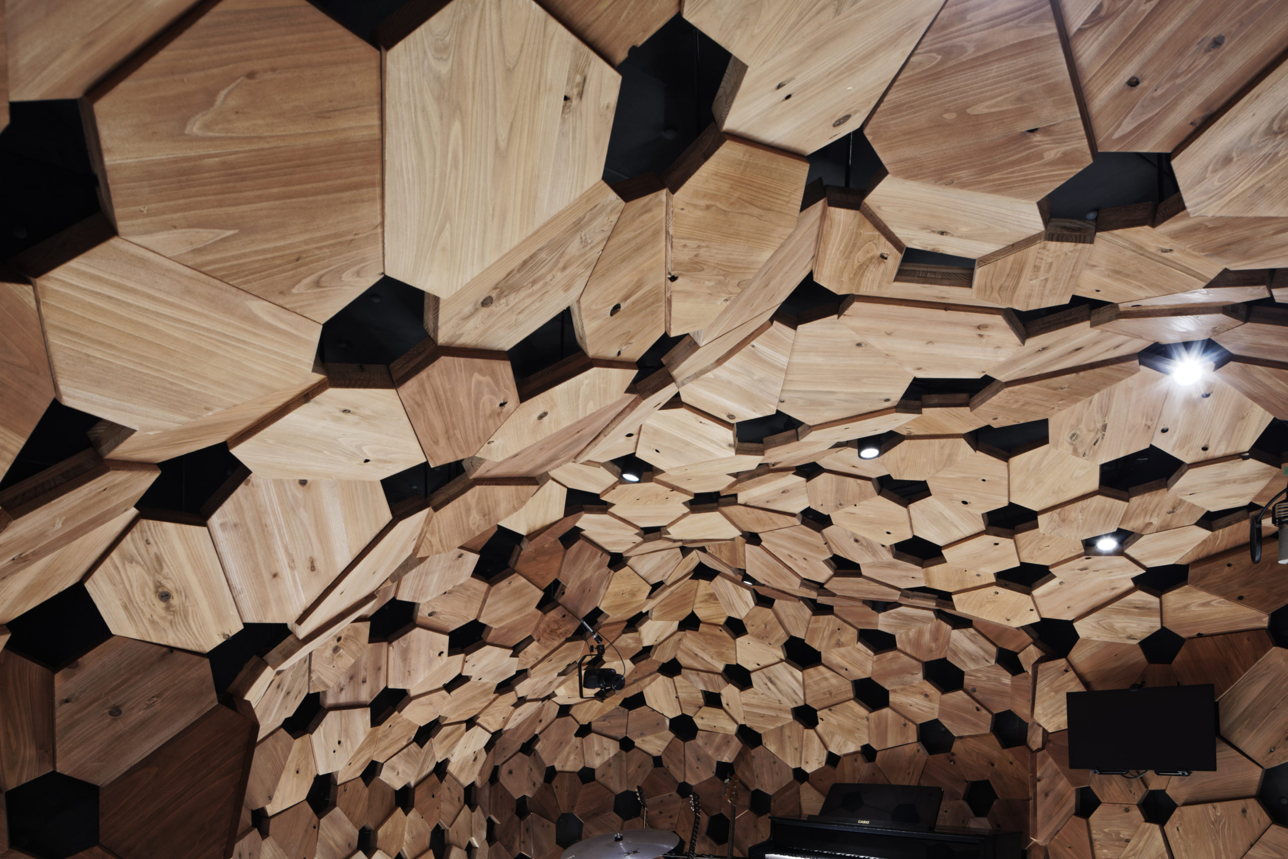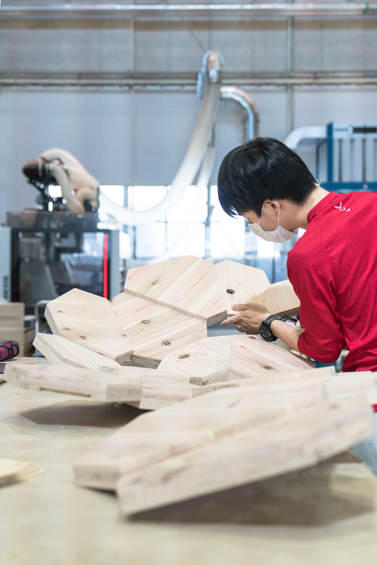 反射板は厚さ36mmの杉板CLTから角度や大きさの異なる603枚の六角形パネルで構成され、5軸CNCミリングマシーン「BIESSE」を用いて高い精度で加工された。照明計画は、機能的な役割を持つ天井からのスポットライトと、空間演出的な床埋込照明で構成される。