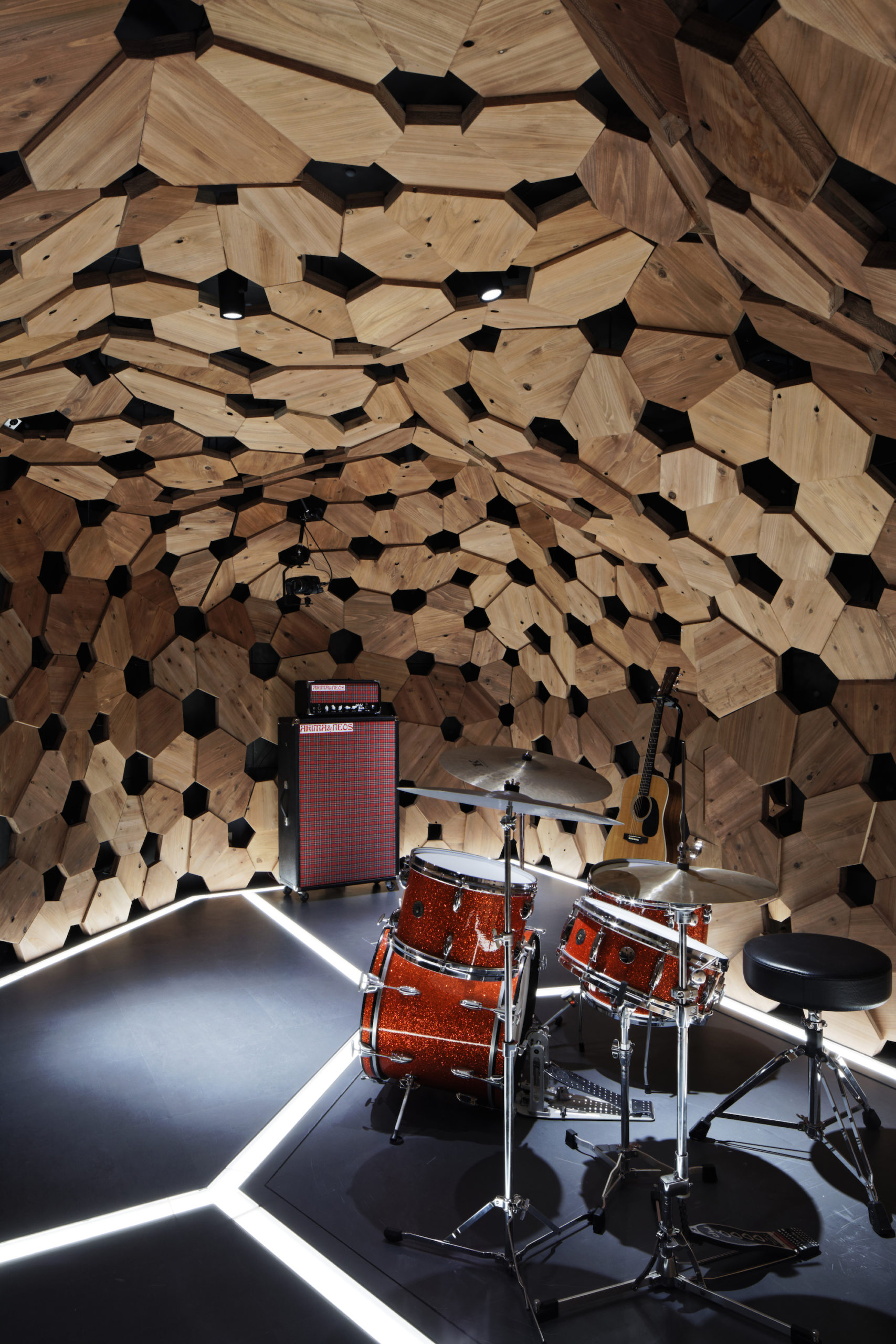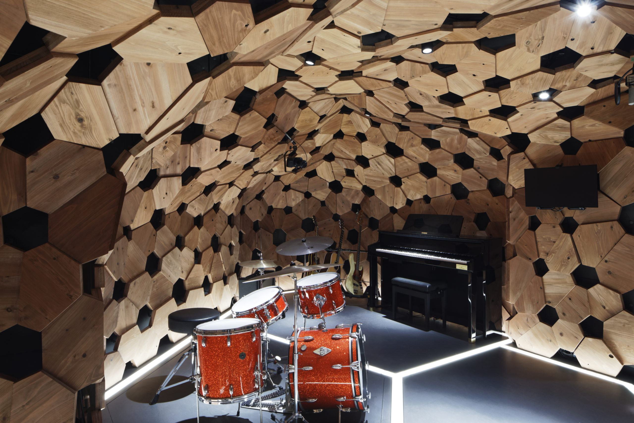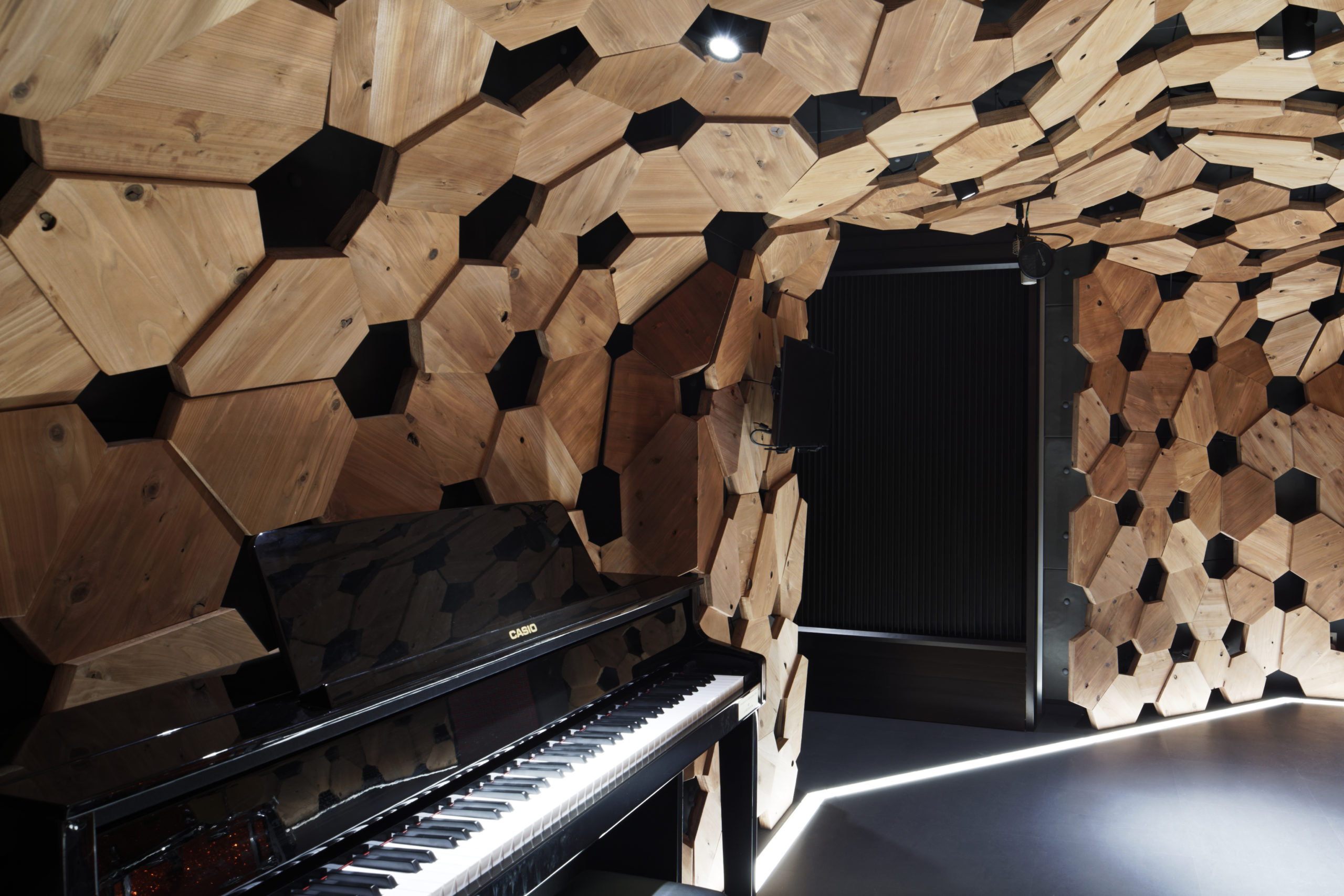 通常スタジオは、主に防音・吸音性能が求めれることが多いが、この計画では空間的反響を加味した「生の音」を収録したいとの要望から、吸音と反射音のバランスがとれた音響空間が求められた。適切な反響音を得るため、室内を不整形な曲面形状を持つ離散的な六角形の反射板で構成し、音をランダムな角度で反射できるものとした。一部の音は曲面に開けられたVOIDから、反射板の裏に設置された吸音材により減衰される。
