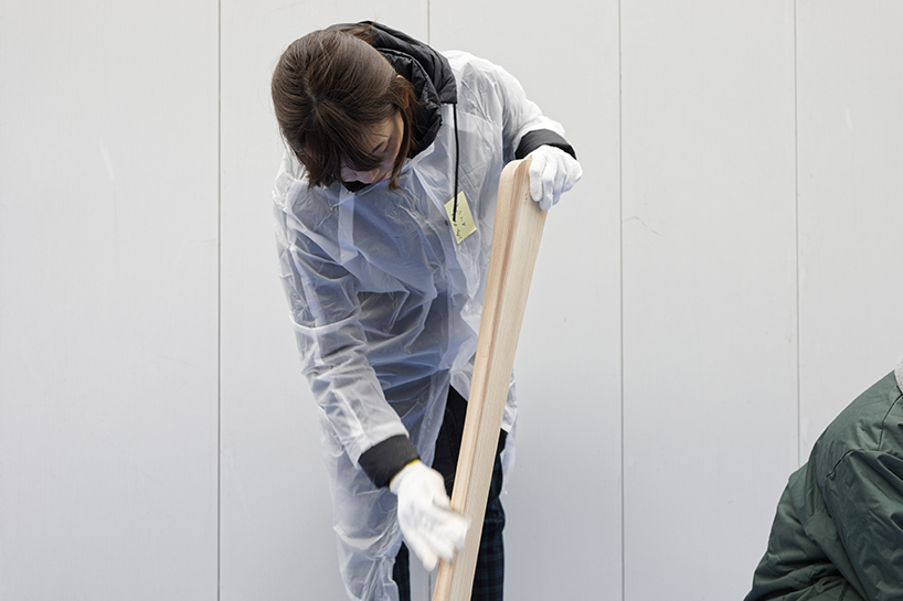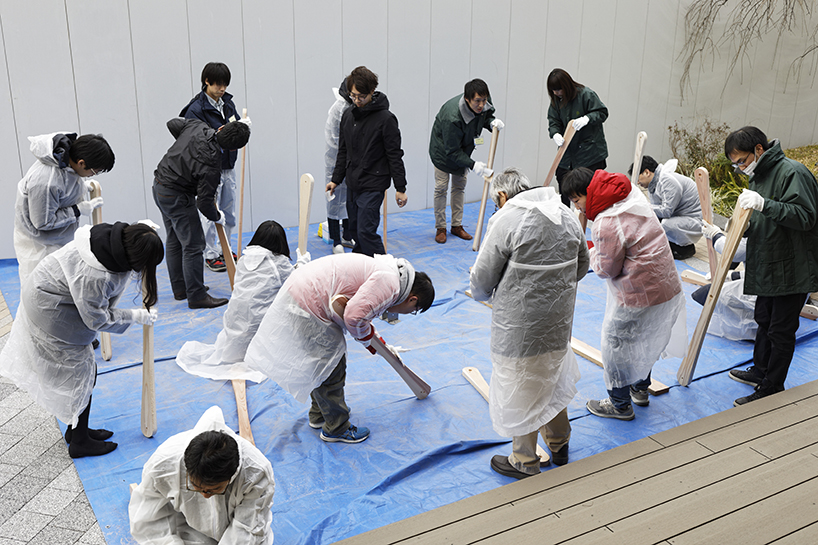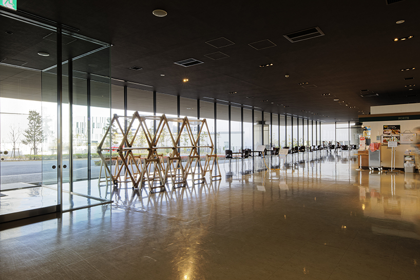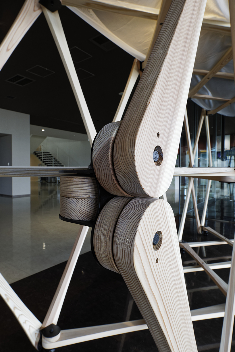 殺風景な場に止まっていたこの空間に伸縮自在な移動式の屋台を取り入れることで、屋内外問わず相互の関わりを意識した空間作りをできるのではないかという考えから生まれた。部材にはエリアのアイコンである多摩川上流に位置する檜原村のスギ材を使用し、産地と消費地をつなぐ試みも行った。パーツをつなげることで伸び続ける屋台は長さを制限しないことから、目的を問わず柔軟に使うことができる。